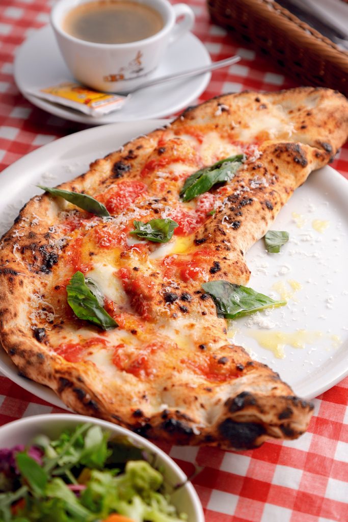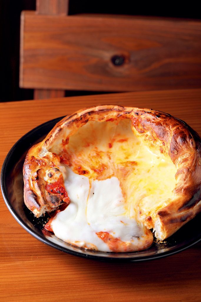 厳選したイタリア産小麦と地元の食材を盛り込んだ、石窯焼きのナポリピッツァを常時16種類ほどラインナップしています。こちらの「カルツォーネ」は、生地の中にチーズと豚バラフリットを閉じ込めた、トマトベースの包み焼きピッツァ。ナイフを入れるとチーズがとろけ出す、アツアツで味わいたい逸品です。