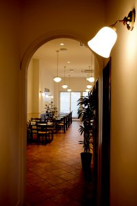 白の塗り壁、テラコッタ・タイルの床、柔らかく落ちる照明。2階の個室希望の場合は予約を