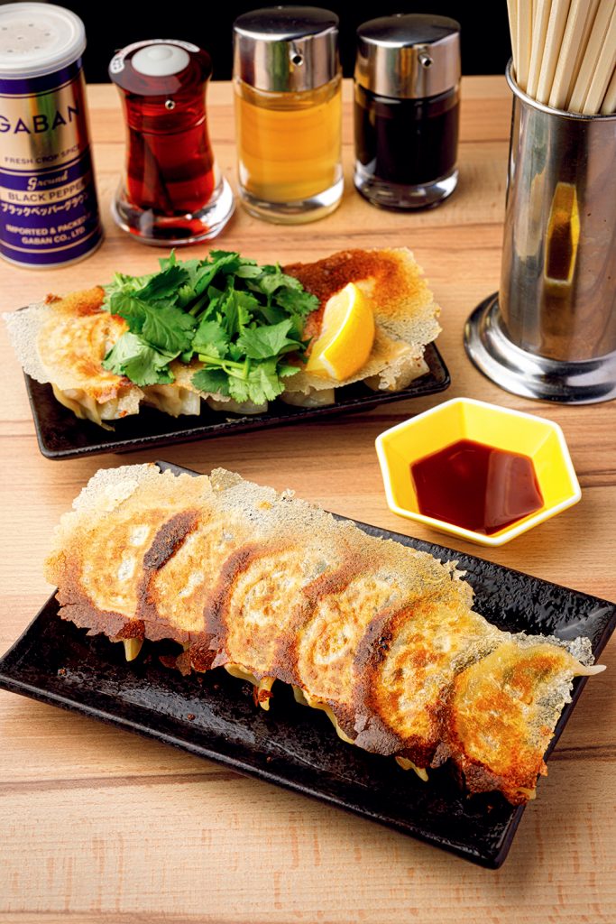 ’19年5月に東日本初進出を果たした、全国に17店舗を構える人気店。ニンニク不使用の焼き餃子や、特製味噌ダレで食べる水餃子などが揃う中、特に注目を集めているのが数量限定の「手羽餃子」です。肉厚な手羽先の中にはショウガが効いた餡がたっぷり! パリッとした鶏肉とジューシーな合い挽き肉を一度に味わえる逸品です。
