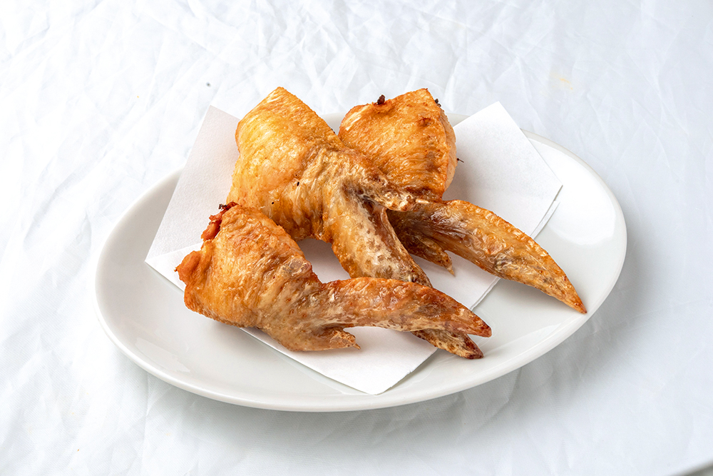 「手羽餃子」(1個209円)。ひとつひとつ手作業で餡を仕込んだ後に素揚げをし、皮をパリッと仕上げています
