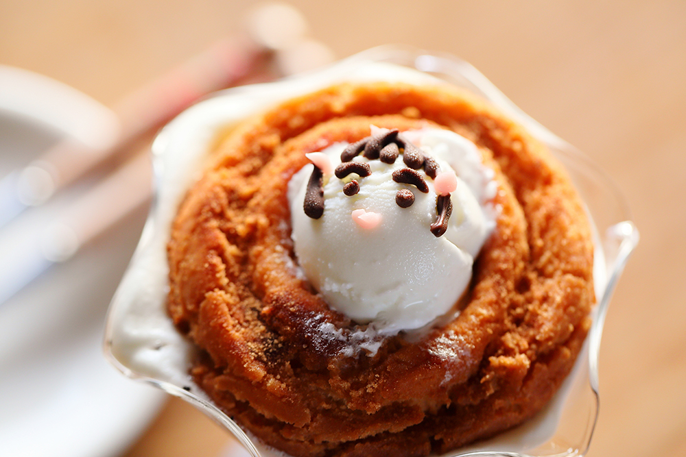 「こけしドーナツパフェ」。シナモン風味のドーナツとミルクジェラートが相性抜群