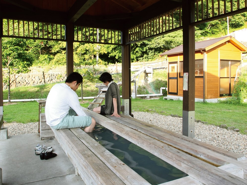 こちらは、温泉街の「湯めぐり駐車場」に併設した源泉かけ流しの足湯です。木の桶をつたって浴槽に流れる湯は、足先だけ浸かっても全身ポカポカ!