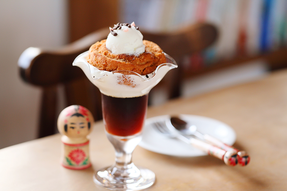 こけしモチーフの雑貨を作る加賀浩嗣さんが奥様・道さんと営むカフェ。名物のこけしドーナツに『なるこりん』のジェラートを合わせた「こけしドーナツパフェ」は、真上から見るとこけしがチラリ。自家焙煎珈琲ゼリーの苦みとのバランスも秀逸ながら、可愛らしさも満点です。