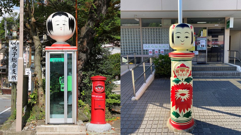 『鳴子総合支所』の電話ボックス(写真左)や『鳴子郵便局前』のポストもこけし!