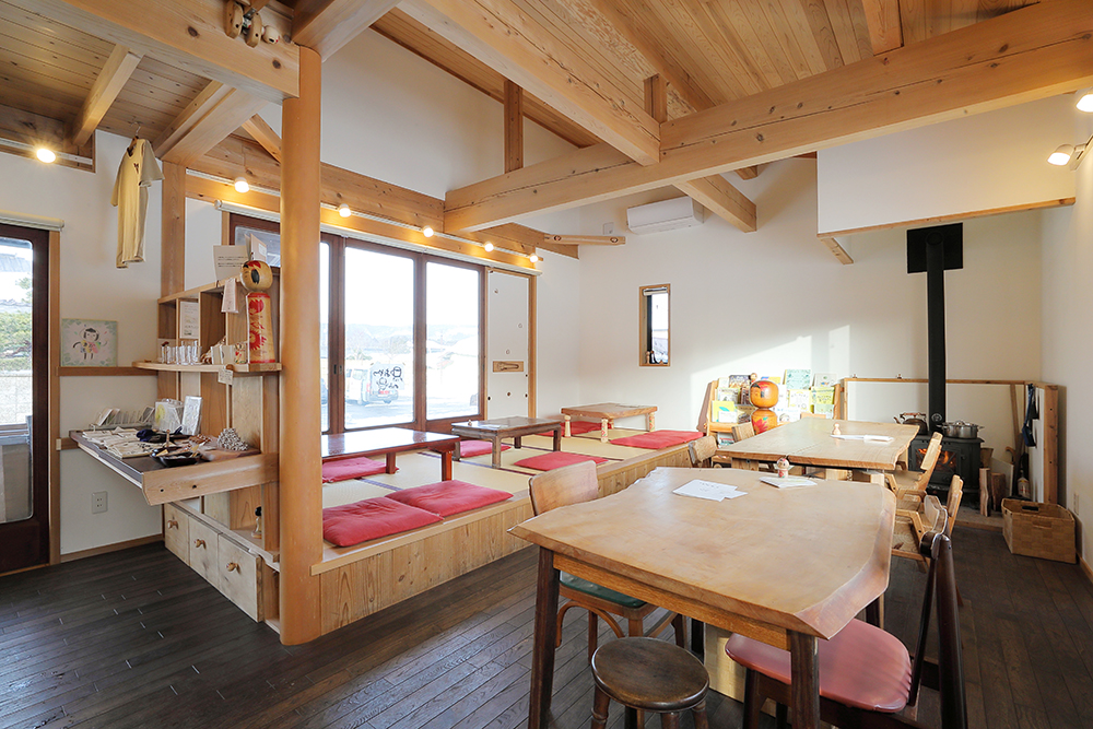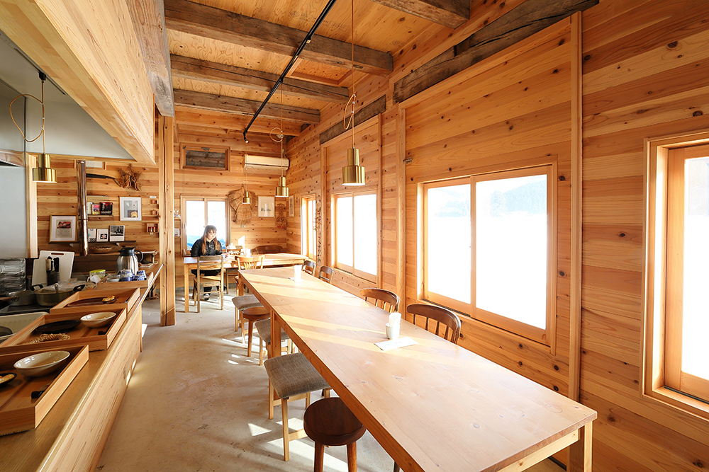 山形県飯豊町から築130年の小屋を移築。着席時の目線に合わせて、大きな窓は低めに設置