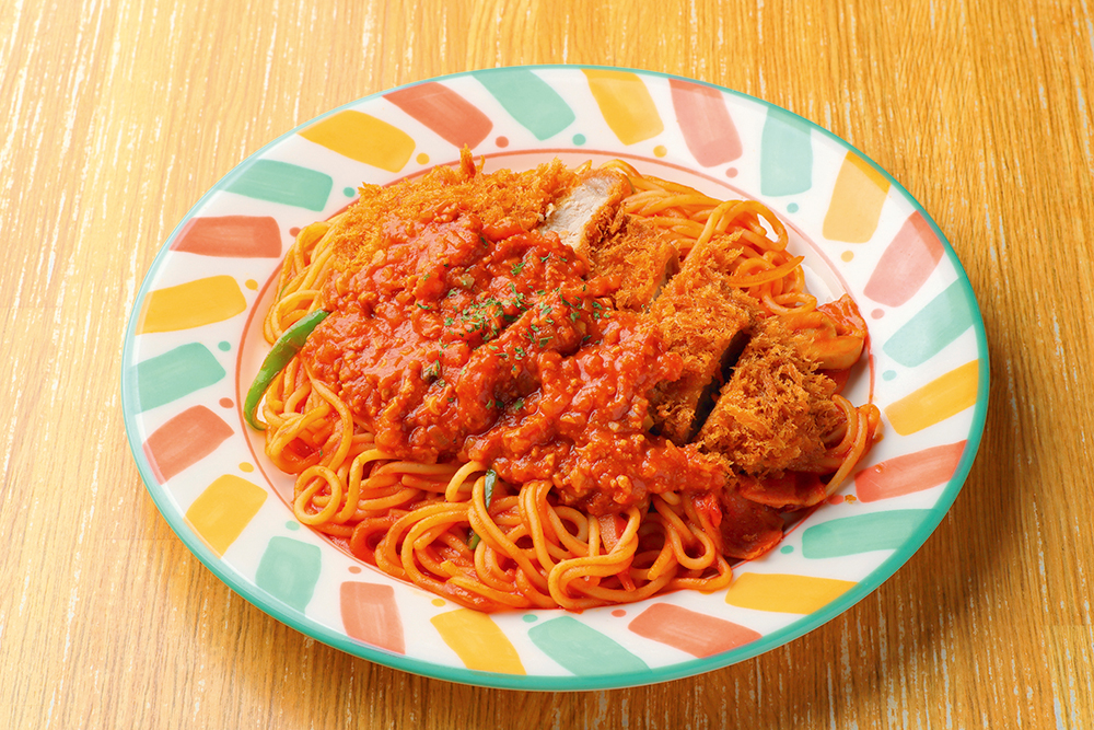 大きな皿にパスタと分厚いロースカツがのった贅沢なひと皿。こちらの定番の楽しみ方は、ミートソースをナポリタンに変更すること。ナポリタンならコク深い自家製ソースが絡んだパスタとカツ、さらにその上にのったミートソースの三位一体が楽しめますよ。柔らかな肉質が特長の無菌豚を生パン粉でふっくらと包んで揚げたロースカツも絶品です。