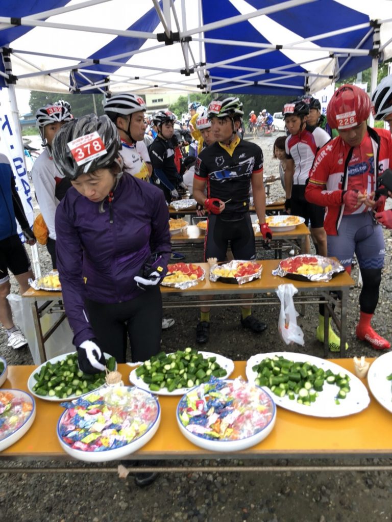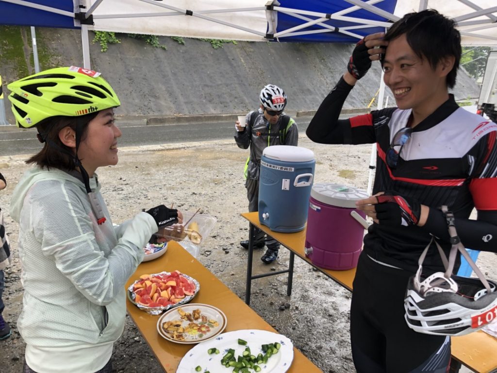 「いや~焦ったな~」とクサカ。エイドステーションのおにぎりや卵焼きでパワーチャージ! ここから峠越えも本番です…がなんだかんだで、最後尾に(笑)