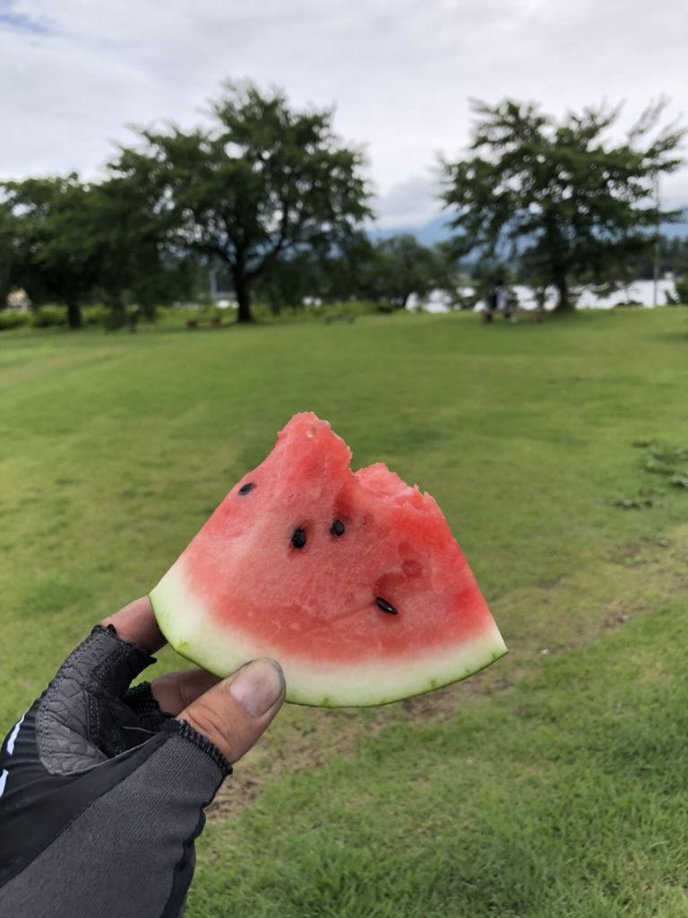 こちらでは、尾花沢の初物スイカや芋煮汁などが振る舞われました。雄大な徳良湖を眺めながら、しばし無言になる3人。復路の峠越えもがんばるぞー!
