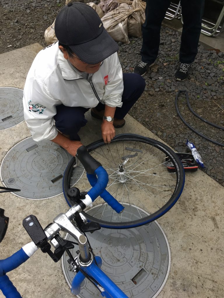 ガッツおそ松のパンク修理を見ていたプロの方に「俺に任せとけ!」と力強い言葉をいただき、ご厚意で修理していただきました(ありがとうございました!)