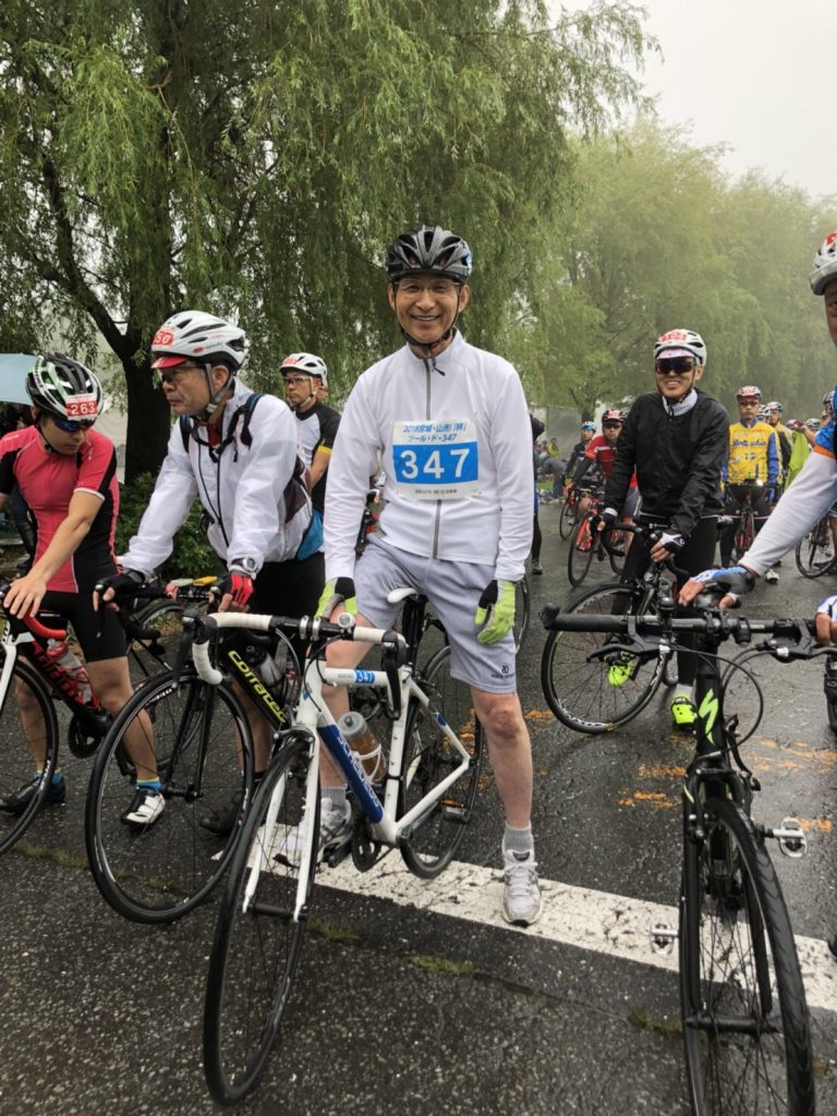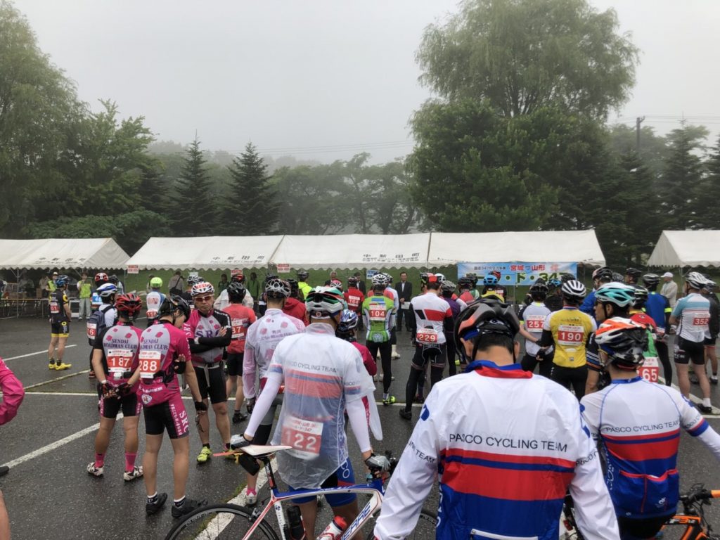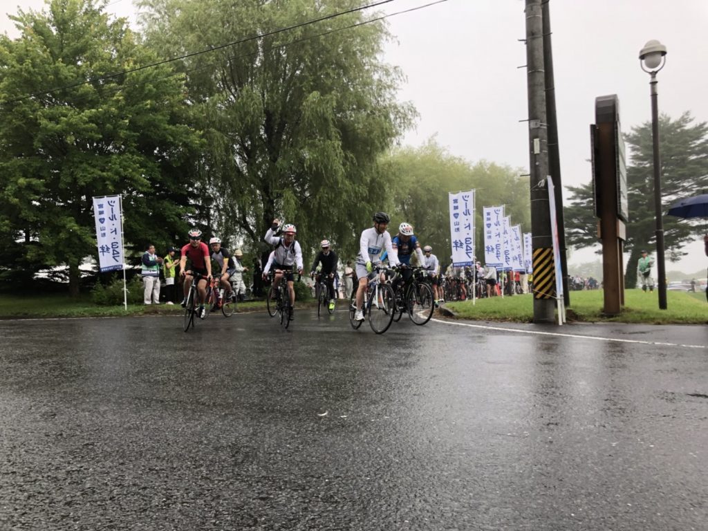早朝に仙台を出発した、我々自転車部。お天気はあいにくの雨ですが、約400名の参加ライダーの皆さんが集まりました! 開会式を終え、スタートの瞬間を待ちます。