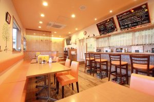 オレンジで統一された明るい雰囲気の店内。絵本やおもちゃが充実しているので、子ども連れにもぴったり