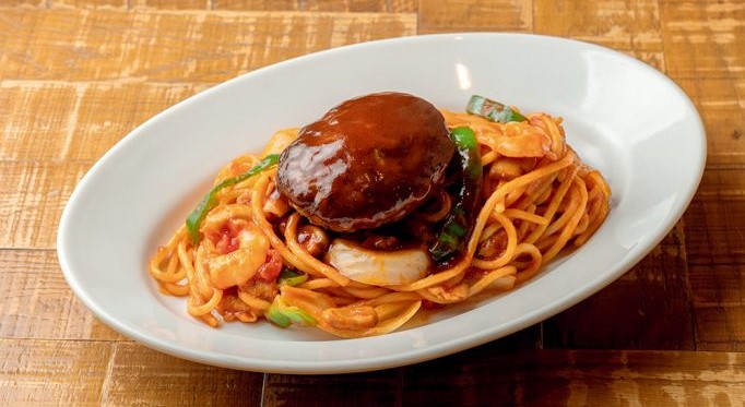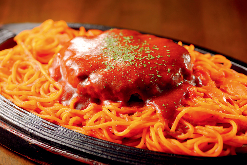 「ナポリタンスタジアム2013」で日本一を勝ち取った名店。もちもち食感の太麺に甘みと酸味のバランスが絶妙な自家製トマトソースをまとわせれば、日本中を魅了したナポリタンの完成です。その上に鎮座するのは、卵をたっぷり使うことで柔らかさを引き出したハンバーグ。自家製デミグラスソースとあふれる肉汁を絡めて、日本一の味を堪能して。