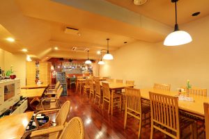 温かみのある色合いで統一された店内。夜はワインに合う多彩なアラカルトが揃っています