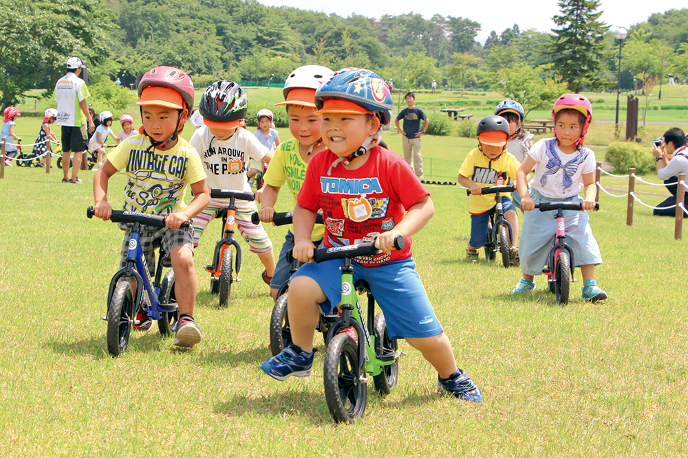 2~5歳の子ども向けペダルなし二輪車「ストライダー」。市街地では公園など楽しめる場所が限られてしまうが、こちらの「やくらいランニングバイクパーク」では、自然に囲まれた芝生のコースで思う存分駆け回ることが可能。「楽しむことが目的」としたレースイベントも開催。