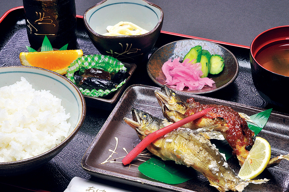 加美町の名産の鮎を一年中食べることができる『あゆの里 物産館』。鮎の塩焼きや天ぷら、田楽などの定番メニューから、好きな味付けの鮎が2尾選べる「あゆ定食」、「温かい鮎天そば」、「冷たい鮎天そば」など、ご当地ならではのメニューも用意。