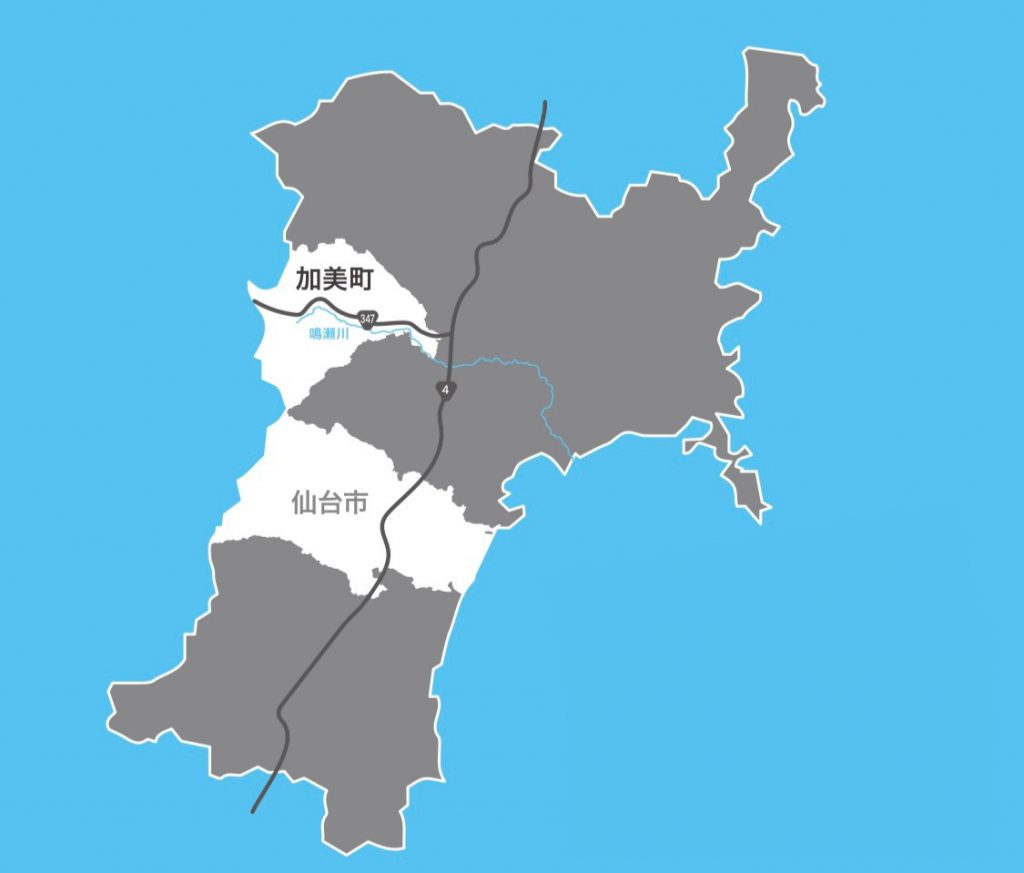 加美町は、宮城県の北西部に位置。山岳、丘陵地の面積が広く、ブナなどの豊かな森林を有する船形山や加美富士と呼ばれ加美町のシンボルとなる薬萊山がそびえています。丘陵地から、鳴瀬川や田川などが流れ、その流域は田園地帯が広がっているので、四季折々の自然の変化が満喫できますよ。