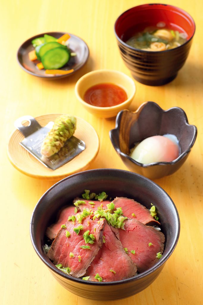 噛むたびに旨みが広がるローストビーフに、加美町の名産品であるワサビをのせた丼。新鮮なワサビは辛みよりも、爽やかな香りがポイント。すりおろす前のワサビも付いてくるので、わさびおろしを使って自分で“追いワサビ”も楽しめますよ。