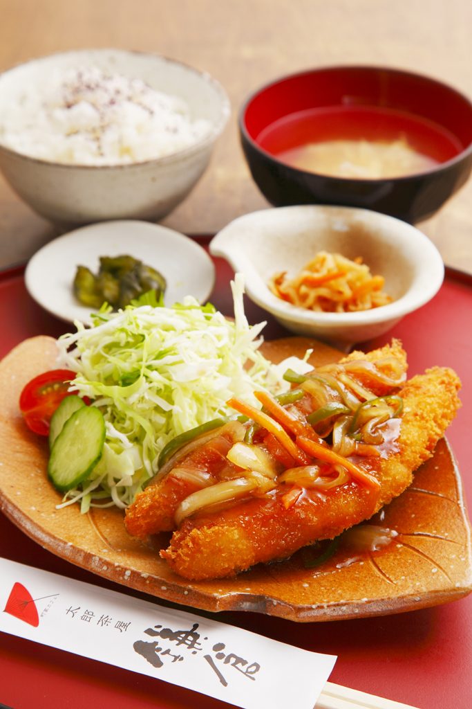 ふっくらした白身魚のフライに野菜たっぷりの甘酢あんがマッチした、店の人気メニュー。ご飯が進む一品だ。