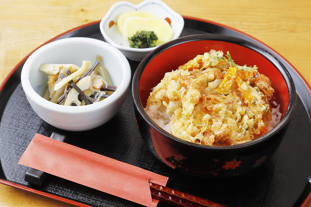 たっぷりの野菜と沼えびのかき揚げを乗せたボリュームある一品。特製のタレが染み込み、ごはんが進むこと請け合いだ。