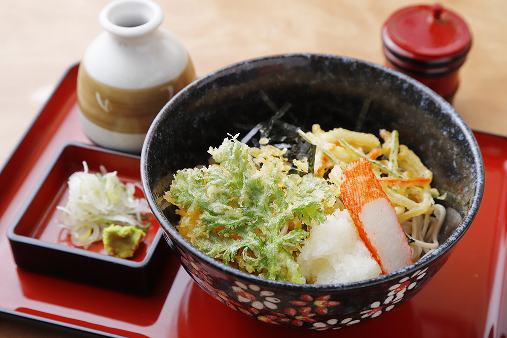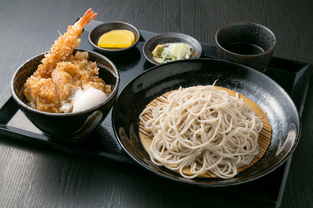 サクサク揚げたての天ぷらに特製天丼タレがからみつく。山形から取り寄せたそばとの相性も抜群のボリューミーなセットだ。
