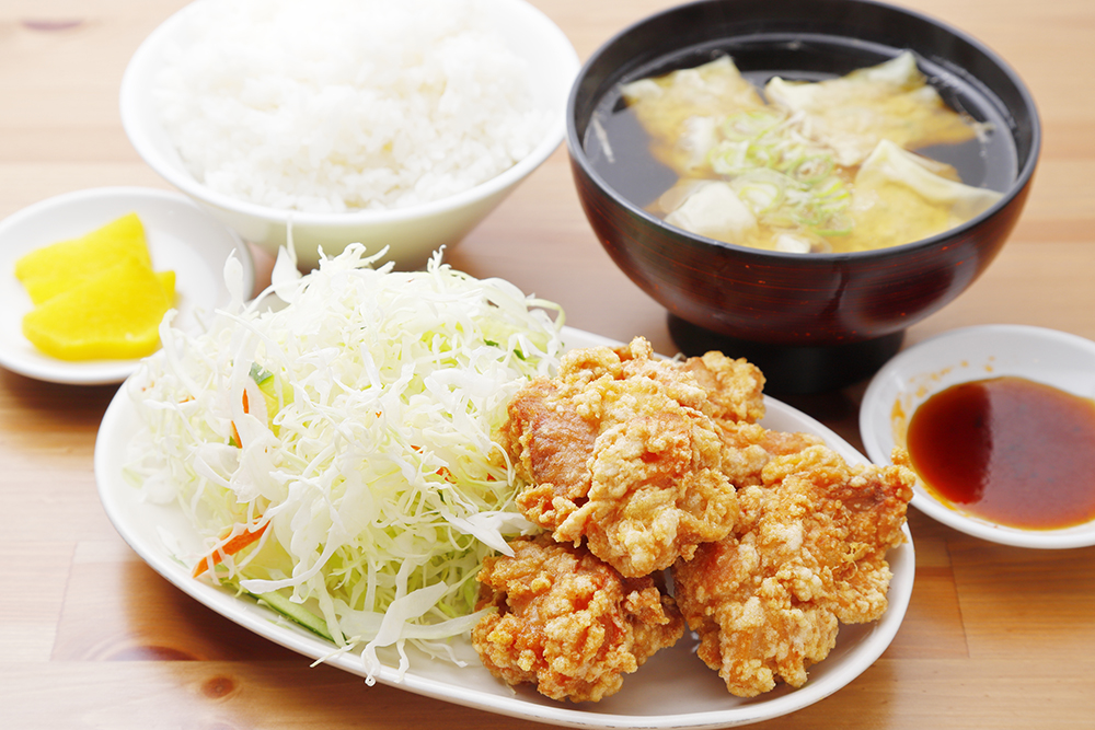 自家製のタレにじっくりと漬け込んだジューシーな唐揚げと、手作りワンタンのスープがセットになったボリュームある一品