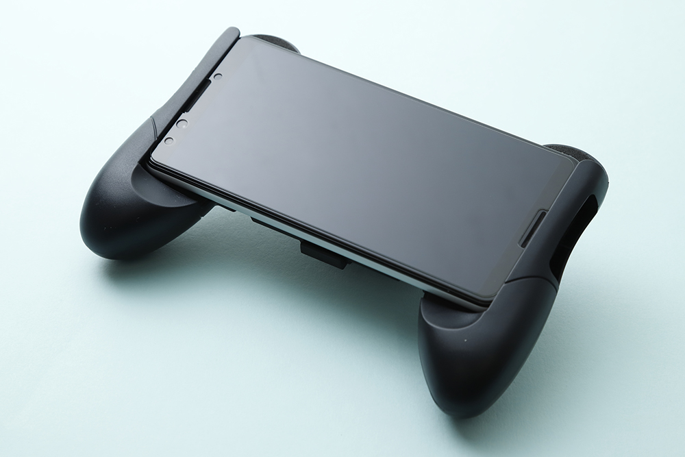 「スマホゲーム用スタンド付グリップ」(110円)。ゲームのコントローラーのようなグリップで持ちやすく、ゲームも動画もマンガも小説もこれひとつで一段と快適に!