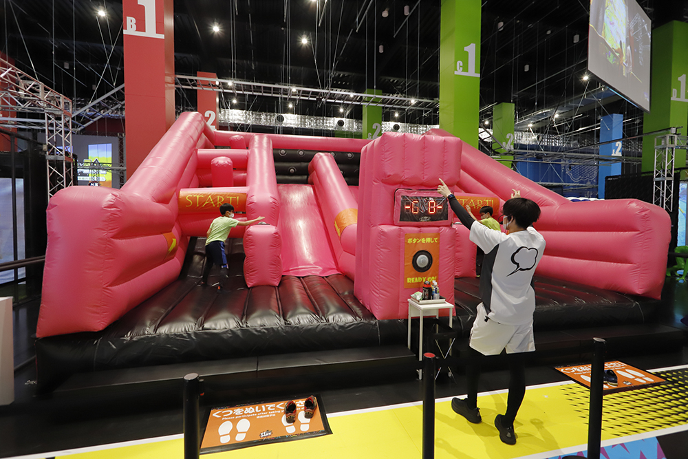 『VS PARK』は、テレビのバラエティ番組に参加しているようなアクティビティ体験ができるエンターテイメント施設。約3,500㎡の広さに、ここでしか体験できない31のバラエティスポーツが集結し、2時間遊び放題で満喫できるんです。坂を登って頂上のボタンを押し、滑り台を降りてくる「UP&DOWN」をはじめ、パワー、スピードが必要な3ステージのクリアを目指す「空中ニンジャ」など、31種類のアクティビティを用意。身体を動かす楽しさを体感することができますよ。