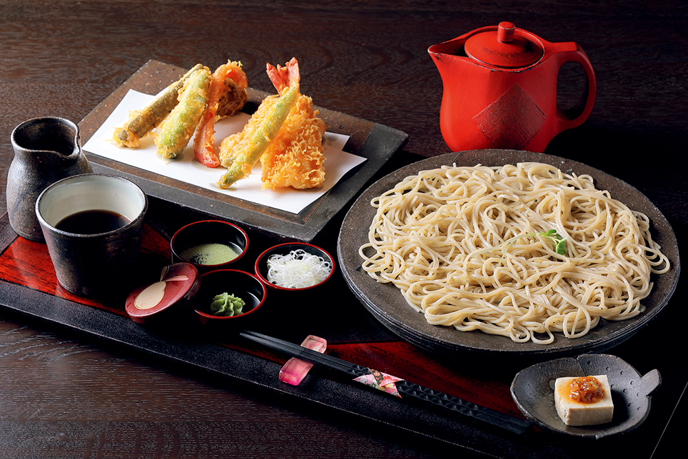 大ぶりのエビが2本のった贅沢御膳「天せいろ」(1,800円)。そば湯も料理の一品としてこだわりを持って提供しています