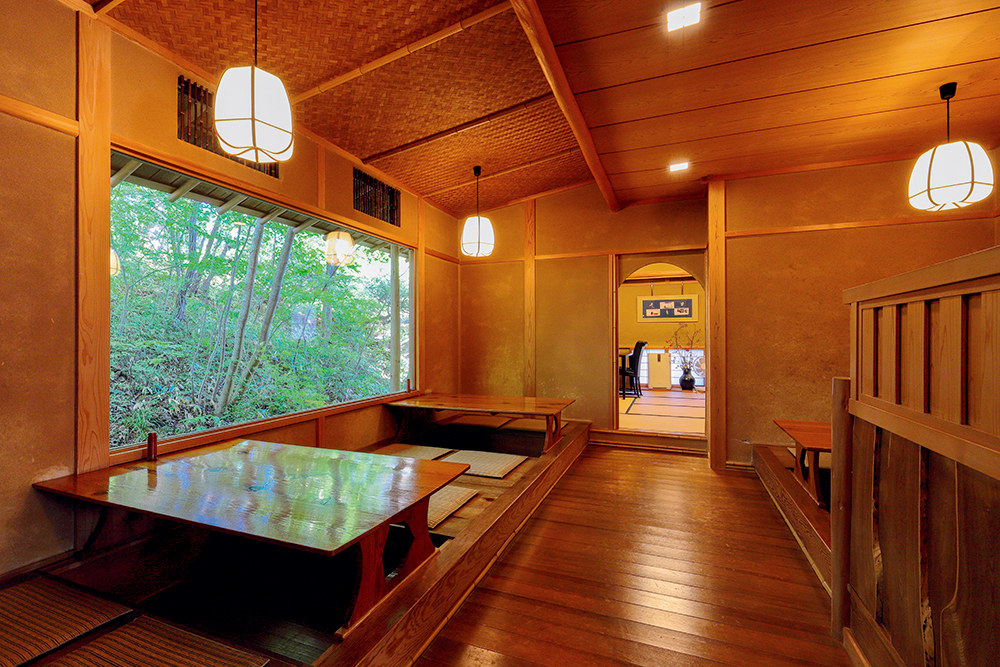 茶室をイメージし、店主自らが作り上げた空間。大きく切られた窓の外には美しい四季の風景が広がっています