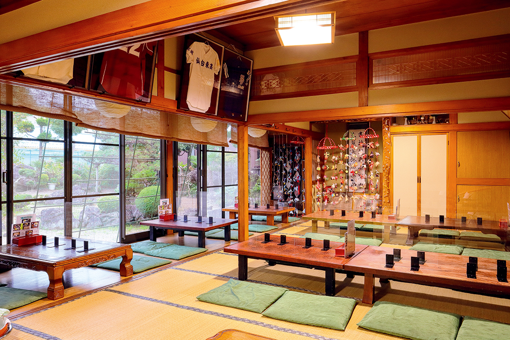 広瀬川を見晴らす絶好の景色とおいしい十割そば、そして謹製の甘味が楽しめる『鹿落堂』。栗駒山の安山岩の石臼で粗挽きに仕立てた手打ちそばは、もちっとした食感とみずみずしさが同居し、そば本来の味と香りを伝えてくれます。店内では伝統工芸品や日本の手工業者による暮らしの道具や器も販売。空間もじっくり味わいたくなる一軒です。