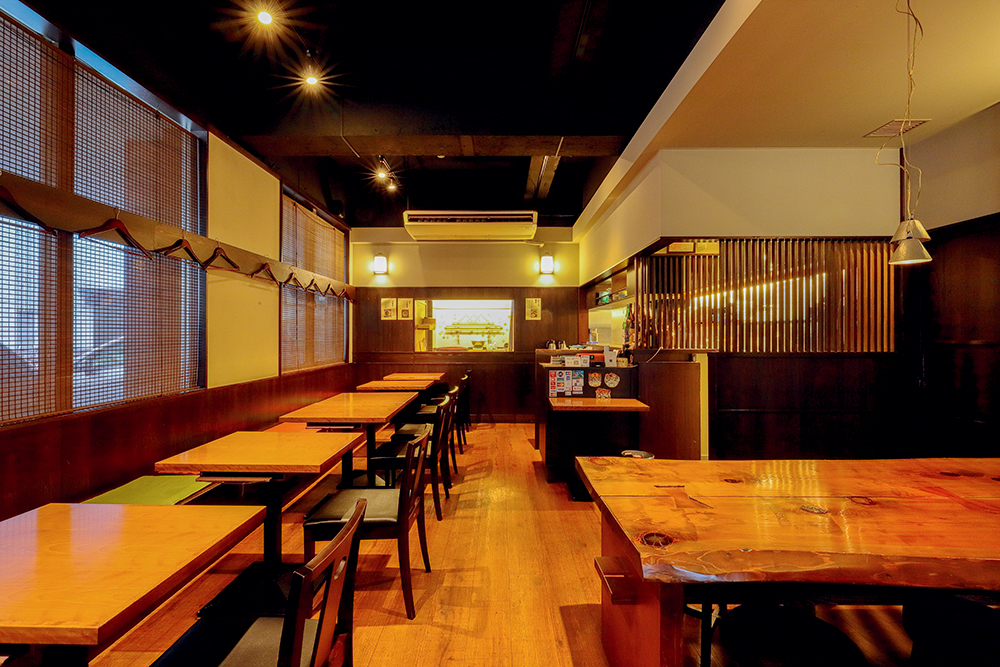 飛騨高山のオーダーメイドデスクが並ぶ和モダンな店内。小上がりもあり、落ち着いた時間を過ごせますよ