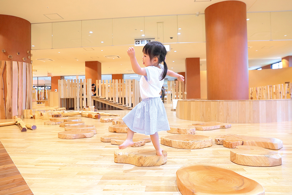 “遊んで、感じて、生きる力を蓄えて”がコンセプト。室内に居ながらのびのびと里山遊びを体験できるとあり、天候を問わず利用できる貴重なファミリースポットです。約20種の木で造られたフロアには、大きなすべり台が目を引くフォレストゾーンをはじめ、5つの区画を展開。童心にかえって、子どもと一緒に身体を動かせます。