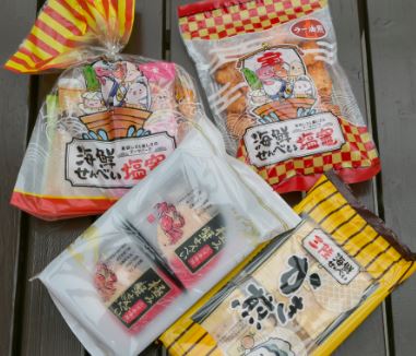 “おいしさと楽しさのテーマパーク”のコンセプトのもと、工場見学や手焼き体験のほか、三陸の海の幸を使った約50種類のせんべいを販売する『海鮮せんべい塩竈』。店に並ぶせんべいは自由に味見ができるのがうれしいポイント。定番のひと品から変わり種まで“午後のおやつ”や“晩酌のお供”など食べる場面を想像しながら吟味する時間を楽しもう!