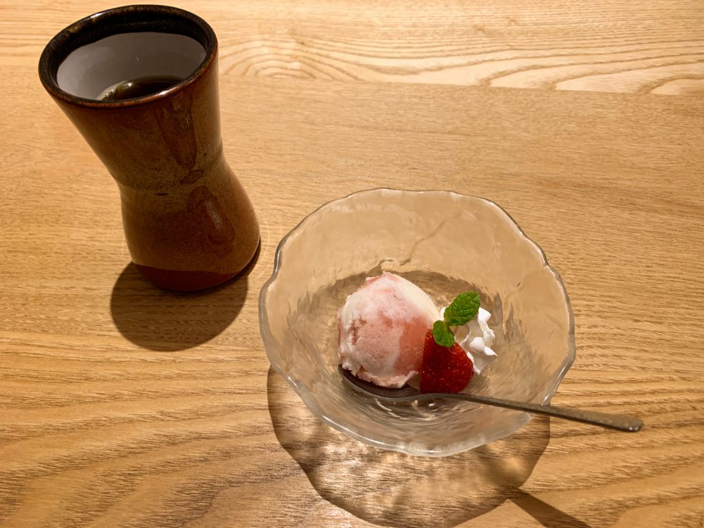 イチゴのジェラートとホットコーヒー。不思議な形のコーヒーカップはなんと湯呑みなんだそう!おしゃれですね