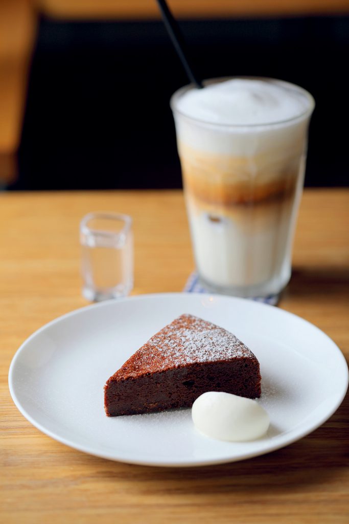 甘さの中に、ビターチョコのほのかな苦みが効いた「ガトーショコラ」(550円)は「アイスカフェラテ」(638円)と一緒に