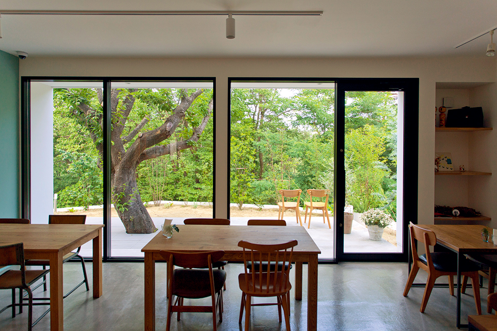 シンプルで落ち着いた雰囲気。席はテーブル席のみで、6人まで利用できる個室もあります。ウッドデッキには樹齢45年の見事な桜の木が