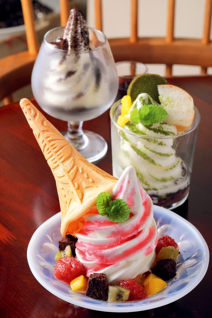 手前より「ソフトクリームパルフェ」、「あんこソフトパルフェ」、深煎りの挽きたて豆を振りかけた「コーヒークランチソフト」