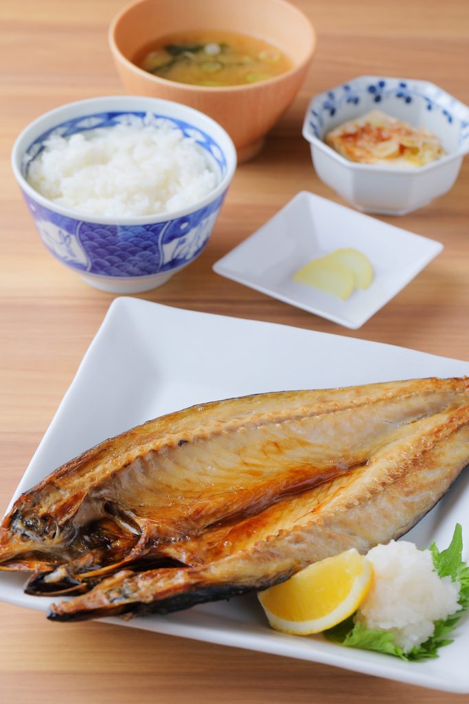 この日の「漁師の気まぐれ定食」(1,300円)には金華サバの塩焼きが登場。魚は焼き魚か煮魚を選ぶことができる