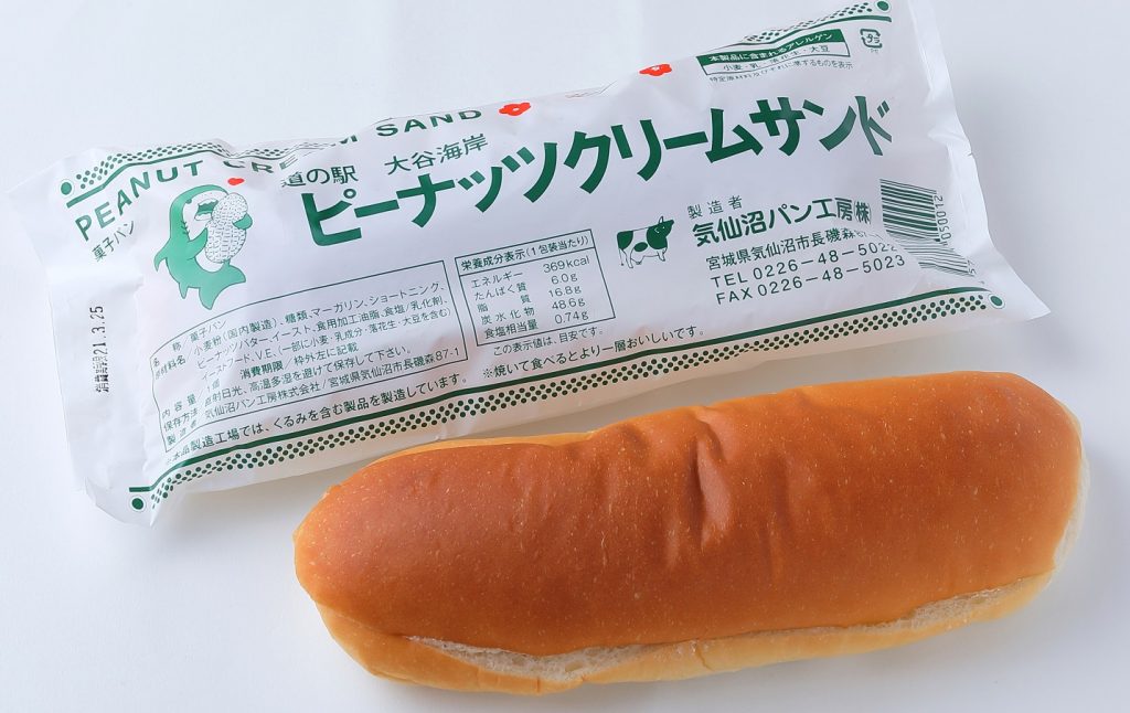「オリジナルピーナッツクリームサンド」(150円)/『気仙沼パン工房』のクリームサンドを、『道の駅 大谷海岸』オリジナルパッケージで販売。ピーナッツを抱えたサメのイラストがキュート!
