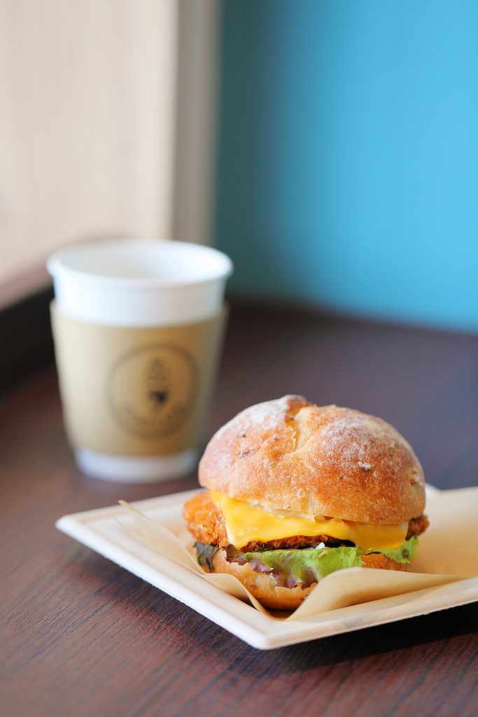 サクサクとした食感が楽しいサメカツを、もっちりバンズでサンドした「サメかつバーガー」(500円)。コーヒーと一緒にどうぞ