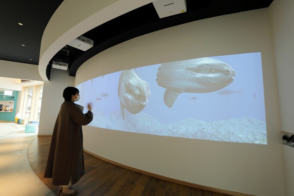 アクアリウムが楽しめるプロジェクションマッピングを新設。壁に近づくと、大きなマンボウが登場する演出が!