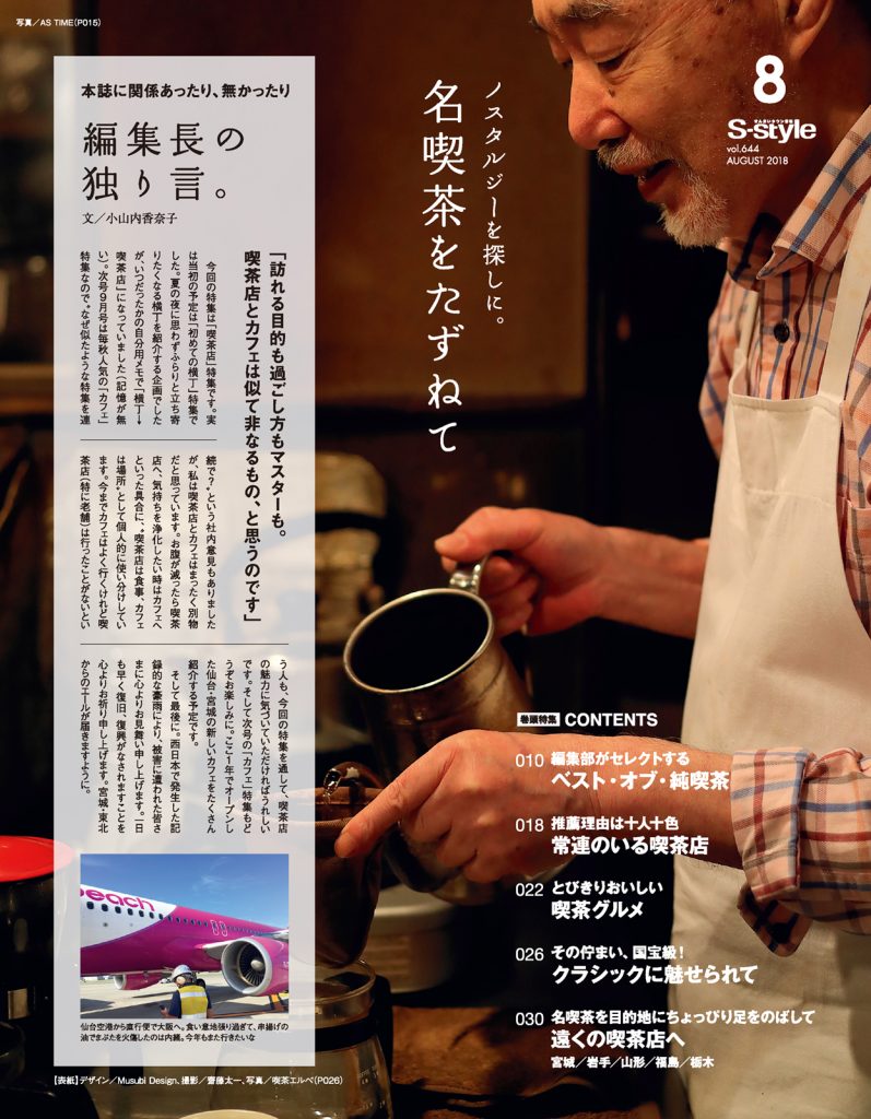 こんにちは~! 編集部はまじです。毎日暑い日が続いていますが、皆さん夏バテなどしていないでしょうか。まだまだ猛暑が続きそうなので、水分補給をしっかりしながら暑さを乗りきりましょうね。さて、そんな暑い日は涼を求めて喫茶店へ行くのはいかがでしょう。ということで、本日発売のS-style最新号「喫茶店特集」のご紹介です!