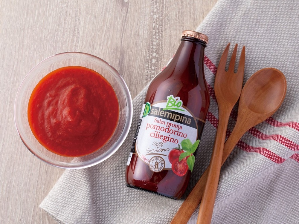 甘く完熟したシチリア産有機チェリートマトを使った『CINAGRO(シナグロ)』の「チェリートマトソース」(330g・880円)。料理をワンランクアップさせてくれるはず