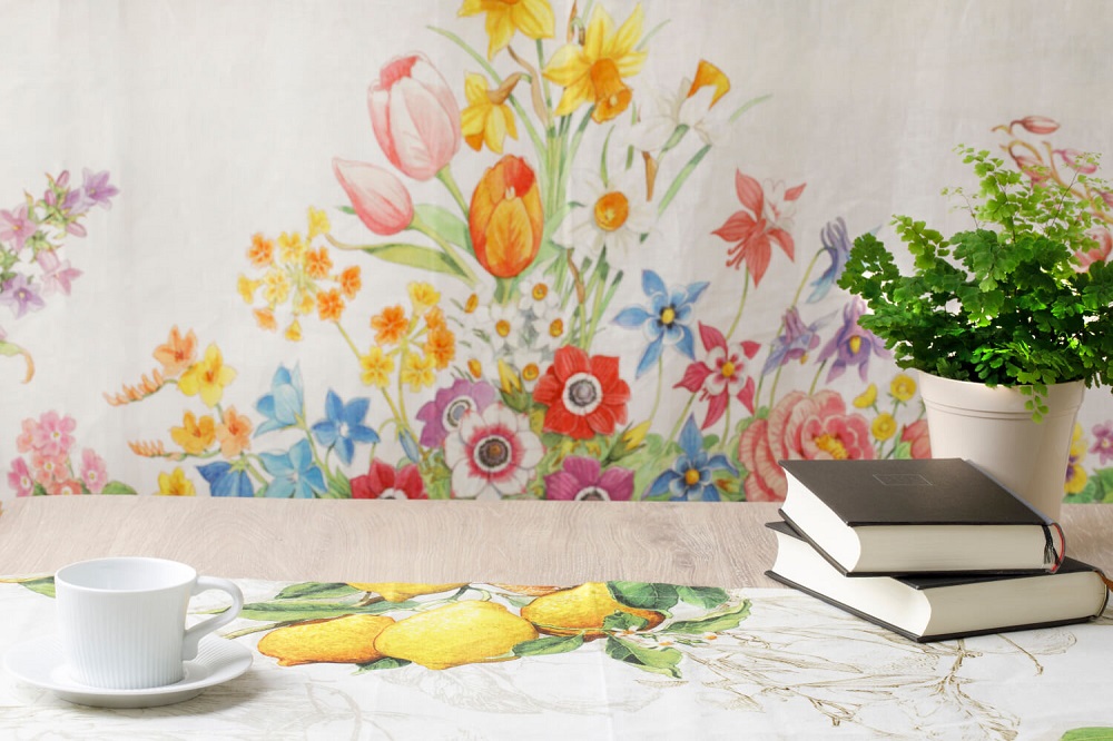 テーブルを一気に華やかにしてくれる「リネンテーブルクロス」(35,200円)、「リネンテーブルランナー」(10,780円)