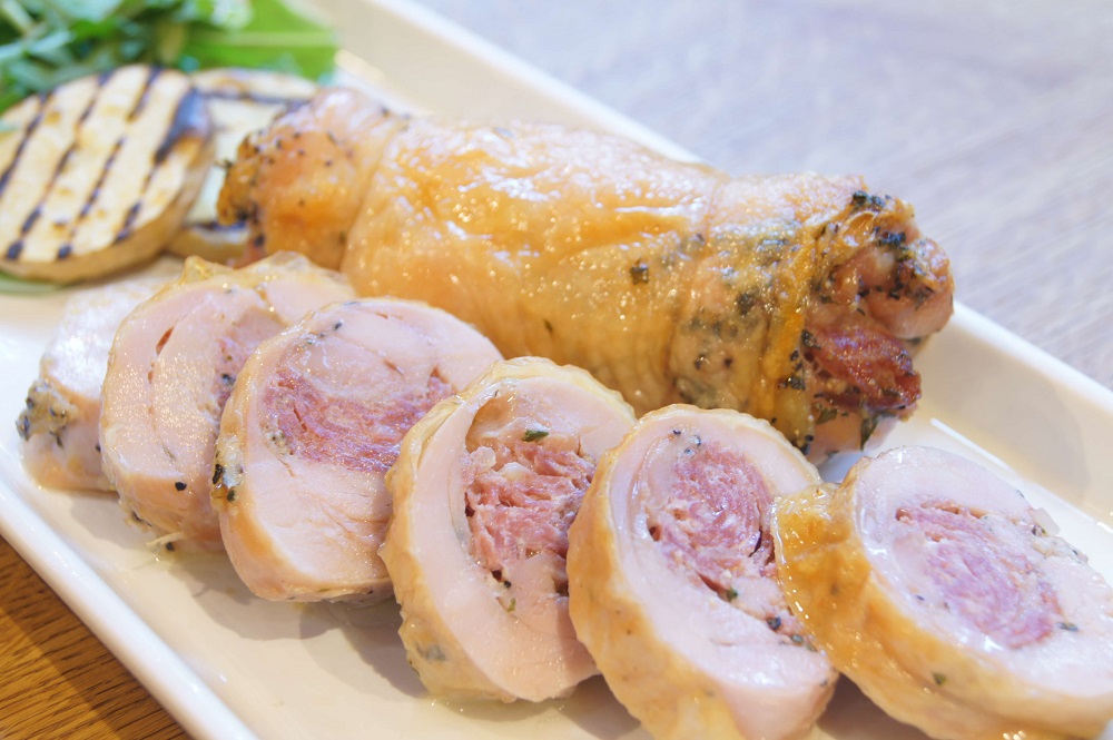 生ハムを鶏もも肉で包んで焼き上げたイタリアのローストチキン「鶏もも肉のインボルティーニ」(100g・324円)。間違いなくワイン必須グルメです・・・!
