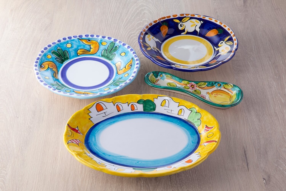 南イタリアの職人による陶器がずらり。メインディッシュを盛りつけるのにぴったりな「オーバルディッシュ」(9,350円)や「パスタ皿」(3,850円)など、ポップでカラフルな絵柄に気分も上がる!