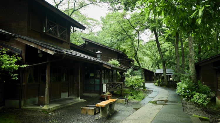 『木の家』は、名取川清流河川敷に接しています。11タイプの17棟のロッジが立ち並んでいて、いずれも宿泊・日帰りともに利用可能です。食器、調理用品、寝具などを完備しているので手ぶらで参加できるのも魅力(バス、トイレは別棟)。バーベキューやいも煮会にも最適です。宿泊の方は渓流岩風呂(温泉)の入浴を無料でご利用できますよ。