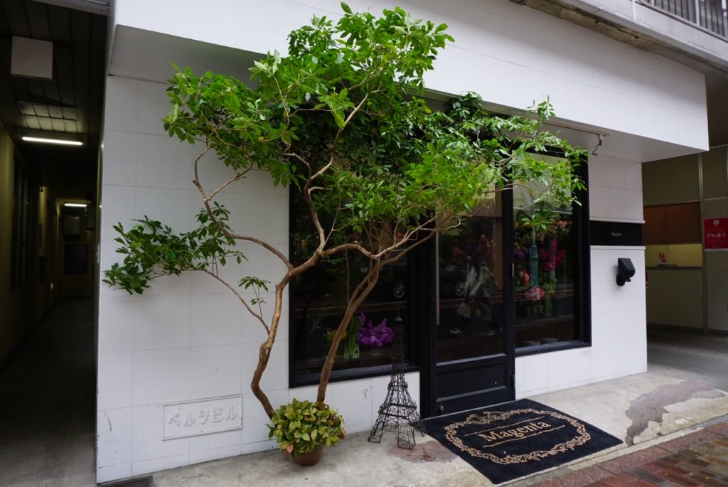 本町の街角、シックな外観に植物の鮮やかな色彩がこぼれています