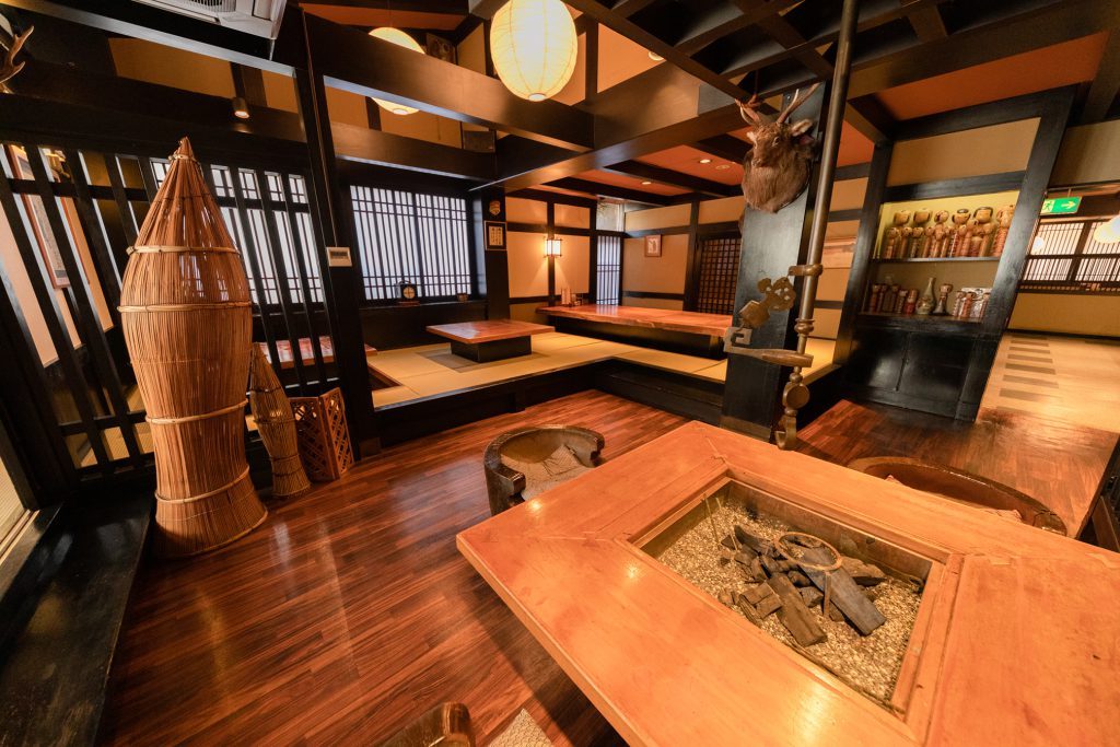 田舎情緒あふれるお食事処「お狩場」。 椅子席・掘りごたつの席があります