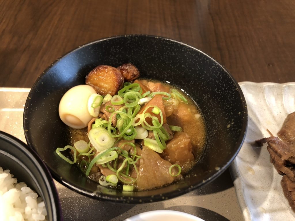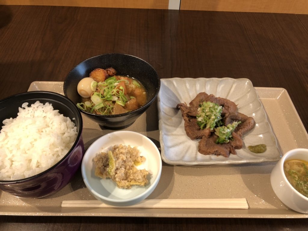 根菜と共にクタクタに煮込まれた豚モツと、ネギ塩がたっぷりのった牛タン、日替りの小鉢、ご飯、スープが付いたプレートが登場しました!うーん、期待が高まる!